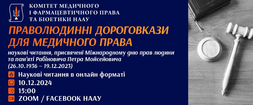 10 грудня 2024 року у НААУ відбудуться наукові читання на тему «Праволюдинні дороговкази для медичного права», присвячені Міжнародному дню прав людини та пам’яті Рабіновича Петра Мойсейовича (26.10.1936 – 19.12.2023).