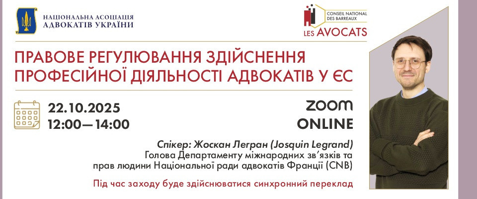 Перший захід на тему «Правове регулювання здійснення адвокатської діяльності адвокатів у ЄС» відбудеться 22 жовтня 2025 року з 12:00 до 14:00 у форматі онлайн.