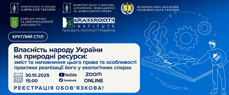 30 жовтня 2025 року в рамках тижня довкілевого права відбудеться круглий стіл на тему «Власність народу України на природні ресурси: зміст та наповнення цього права та особливості практики реалізації його у екологічних спорах».