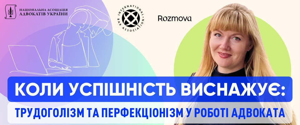 Національна асоціація адвокатів України за підтримки Міжнародної асоціації юристів (International Bar Association, IBA) запрошує адвокатів на вебінар «Коли успішність виснажує: трудоголізм та перфекціонізм у роботі адвоката», який відбудеться 4 грудня 2025 року о 16:00 на платформі Zoom із трансляцією на YouTube та Facebook-сторінці НААУ.