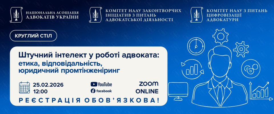 25 лютого 2026 року у НААУ відбудеться круглий стіл на тему «Штучний інтелект у роботі адвоката: етика, відповідальність, юридичний промтінженіринг».