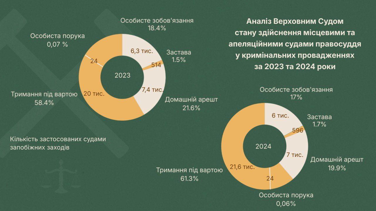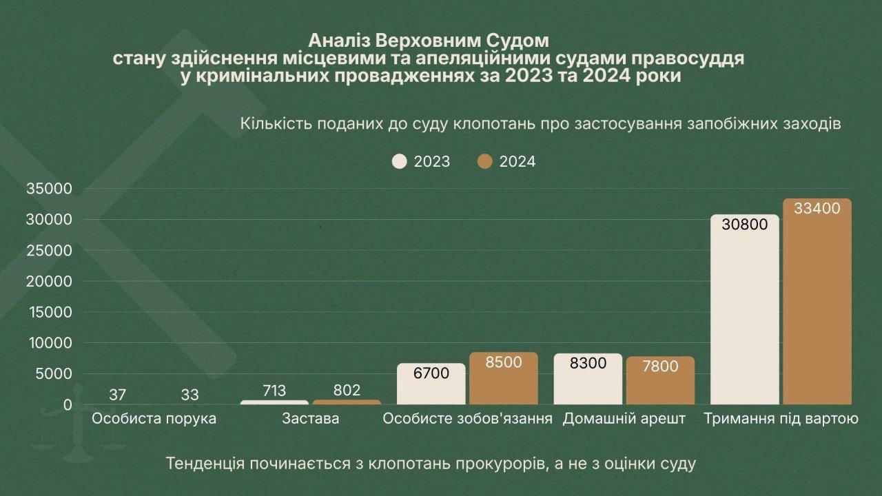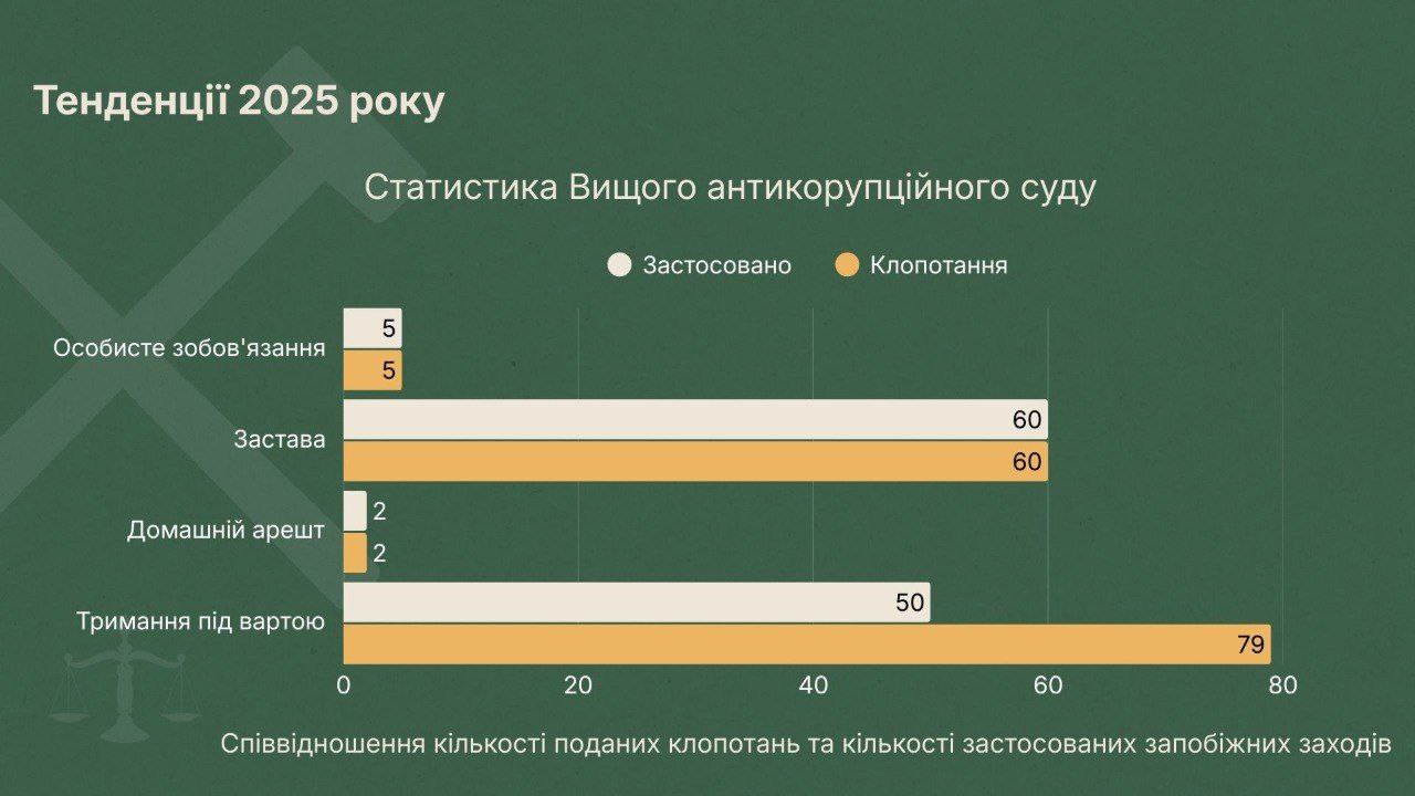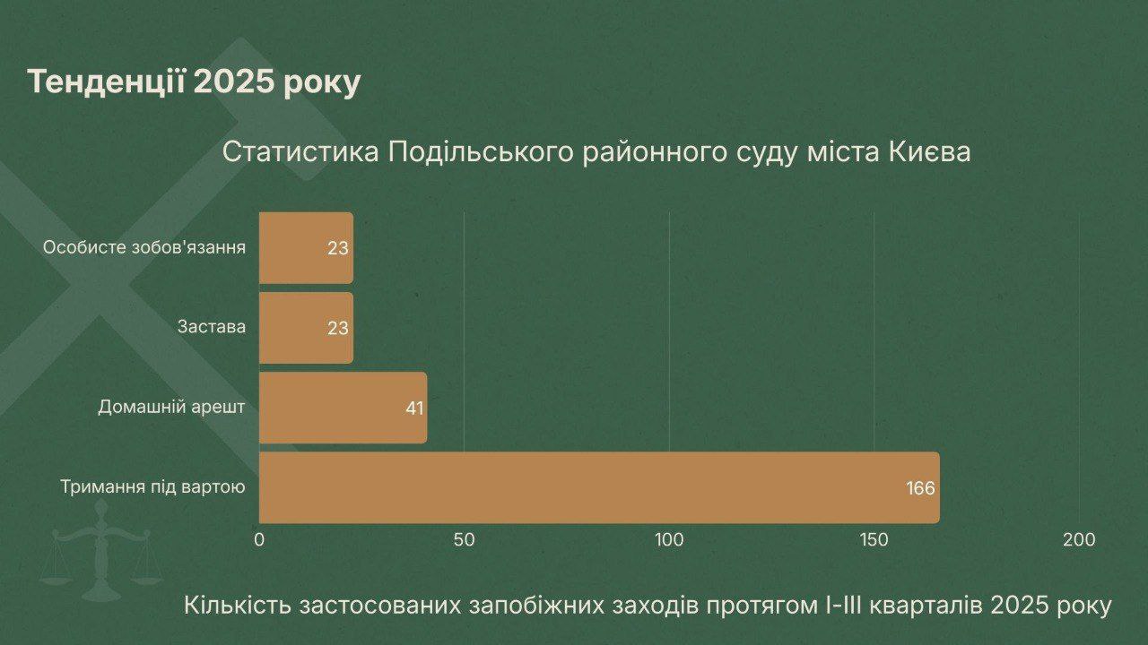 Показовою є статистика Вищого антикорупційного суду, де у 2023 році було задоволено 83% клопотань про арешт, а у 2024 - 62,5%. Динаміка за I–III квартали 2025 року також показала суттєву різницю в підходах між судами: у Вищому антикорупційному суді було задоволено 50 клопотань про тримання під вартою (43% серед усіх обраних запобіжних заходів), тоді як у Подільському районному суді міста Києва – 166 клопотань (майже 66%). Така різниця демонструє не лише відсутність узгодженого стандарту, а й істотну залежність рішень від усталених практик конкретного суду.