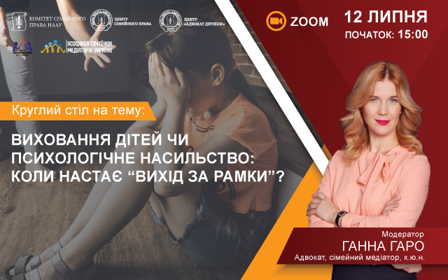 Національна асоціація адвокатів України за ініціативою Комітету з сімейного права спільно з Центром «Адвокат дитини» ВША НААУ, Центром сімейного права ВША НААУ, ГО “Центр сімейно-правових досліджень”, Асоціацією сімейних медіаторів України організовує круглий стіл на тему: «Виховання дітей чи психологічне насильство: коли настає «вихід за рамки»?».